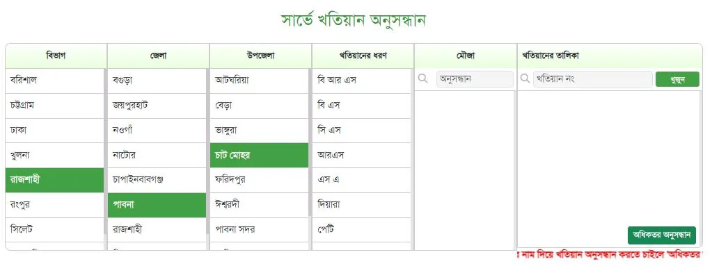 - ধারাবাহিকভাবে বিভাগ, জেলা এবং উপজেলা সিলেক্ট করতে হবে। এরপর সাত ধরণের খতিয়ান সন্ধান করার অপশন আসবে,